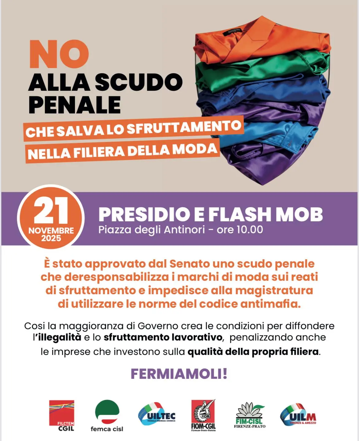 Roma, 20 novembre - "Domani la Cgil nazionale sarà a Firenze, in piazza degli Antinori, alla manifestazione indetta unitariamente da Filctem Cgil, Femca Cisl, Uiltec Uil, Fiom Cgil, Fim Cisl e Uilm, al fianco delle lavoratrici e dei lavoratori del settore tessile, per dire no allo scudo penale che tutela lo sfruttamento nella filiera della moda". Così dichiara, in una nota, Alessandro Genovesi, responsabile del contrasto al lavoro nero della Cgil nazionale.