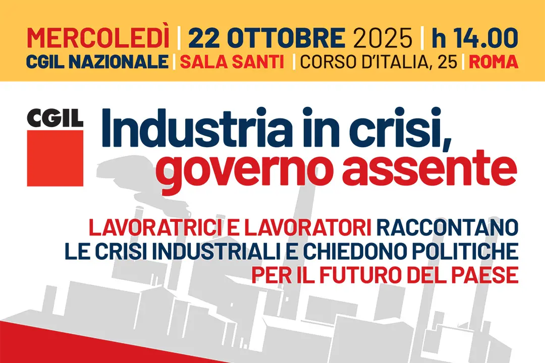 Roma, 17 ottobre - "Industria in crisi, governo assente", questo il titolo dell'iniziativa che si terrà mercoledì prossimo a Roma, nella sede della Cgil, organizzata nel percorso di avvicinamento alla manifestazione nazionale del 25 ottobre.